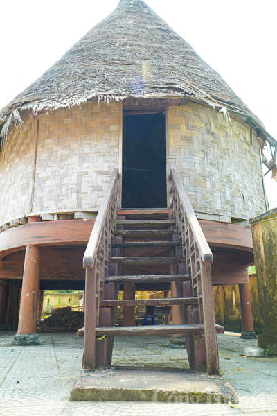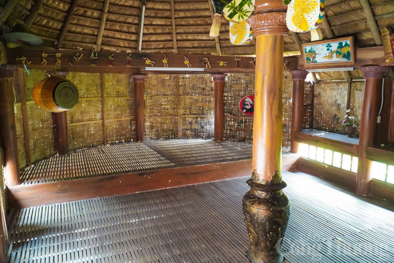 | Nhà Gươl được làm theo hình mai rùa có cột ở giữa và xung quanh là các cột nhà, thể hiện sự đoàn kết các làng với nhau. |