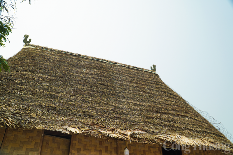 | Trên nóc nhà có con gà trống là con vật linh thiêng, nó giống như vị thần bảo hộ của người Cơ Tu. Mái nhà được lợp bằng lá nón hoặc lá mây. |