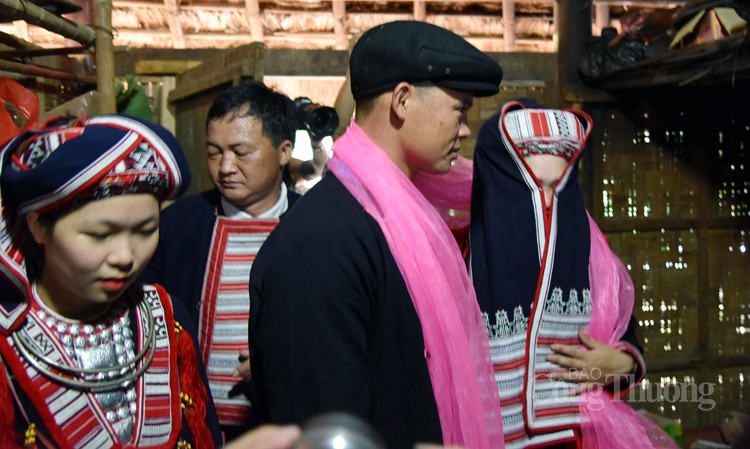 Khi các nghi lễ được tổ chức xong xuôi, cô dâu chú rể vào nhà quỳ lạy trước bàn thờ tổ tiên, nhận chén rượu và trang sức vàng bạc do cha mẹ chồng và họ hàng trao tặng. Hình ảnh hai vợ chồng trẻ buộc dải khăn đỏ thể hiện sợi dây tơ hồng gắn kết tình yêu của họ, như lời chúc phúc cho cuộc sống hạnh phúc bền lâu.