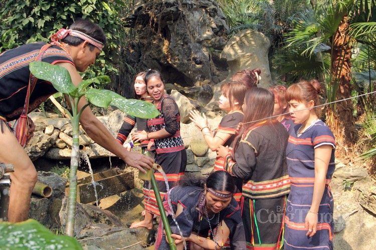 | Đồng bào uống những bát nước trong mát lấy từ nguồn nước Yàng đã ban cho |