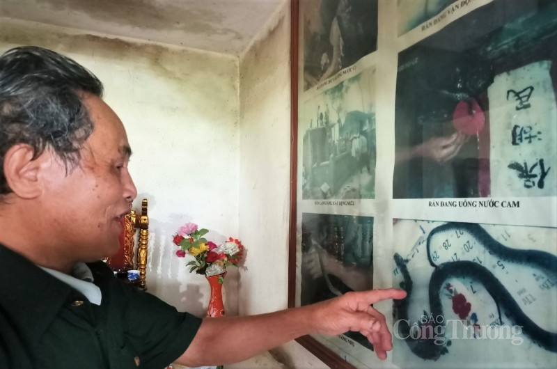 Ông Phan còn giới thiệu với chúng tôi về những hình ảnh chụp con rắn nước được trưng bày trong miếu thờ, đến xác rắn được cất giữ trong chiếc hòm kính đầy “linh thiêng”.