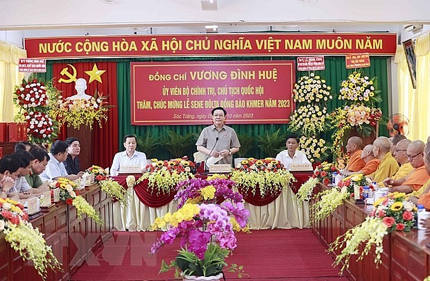 | Chủ tịch Quốc hội Vương Đình Huệ chúc mừng các chư tăng, phật tử và đồng bào Khmer nhân dịp Lễ Sene Dolta năm 2023. Ảnh: TTXVN |