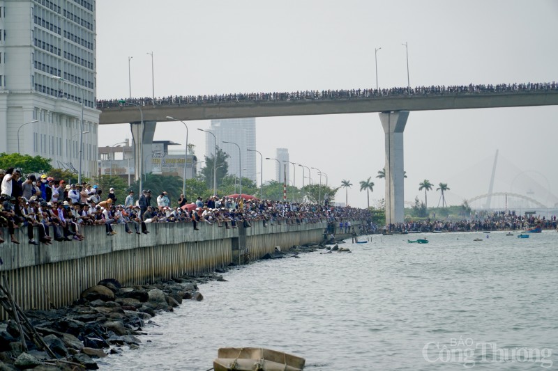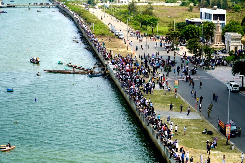 Đông đảo du khách và người dân địa phương đã đến chứng kiến các vận động viên tranh tài ở Hội đua thuyền bên bờ sông Hàn, thành phố Đà Nẵng.